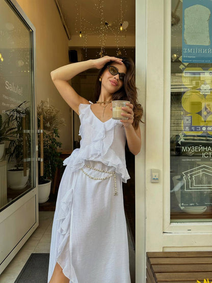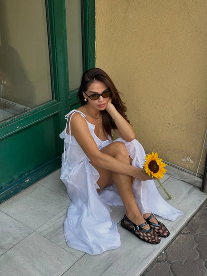 Light, elegant and romantic chiffon dress in delicate white color is the perfect choice for creating a feminine and sophisticated look. The soft fabric drapes beautifully, emphasizing the figure, and the decorative ruffles on the hem give the dress a special charm and playfulness. Transparent sleeves add lightness, creating the effect of effortless elegance.