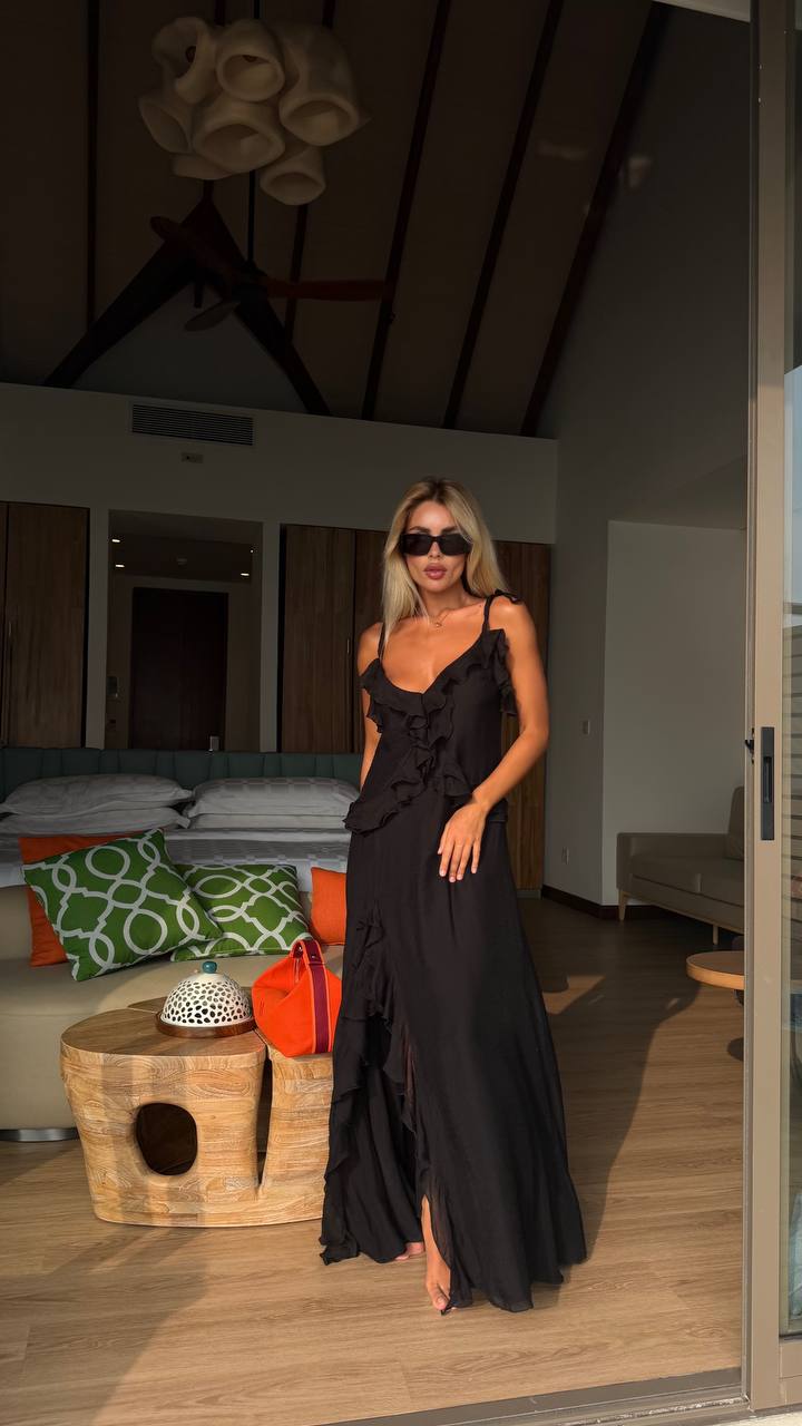 Елегантна чорна сукня з легкою хвилястою фактурою створює витончений і жіночний силует. Модель має тонкі бретелі та асиметричні рюші, які красиво підкреслюють лінію декольте й додають образу руху та легкості. Розріз спереду робить сукню ще більш ефектною та комфортною для ходи.