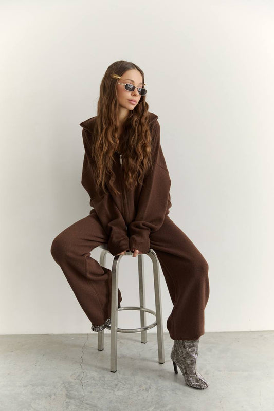 Комплект з вовни ягня кардиган на блискавці і брюки, шоколадний