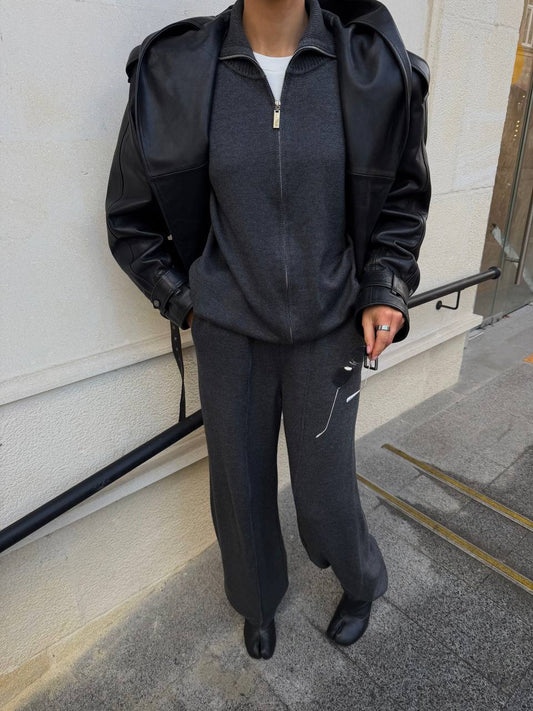 Комплект з вовни ягня кардиган на блискавці і брюки, графітовий