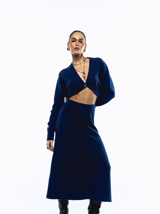 Комплект з вовни ягня: кардиган на ґудзиках і спідниця міді, синій