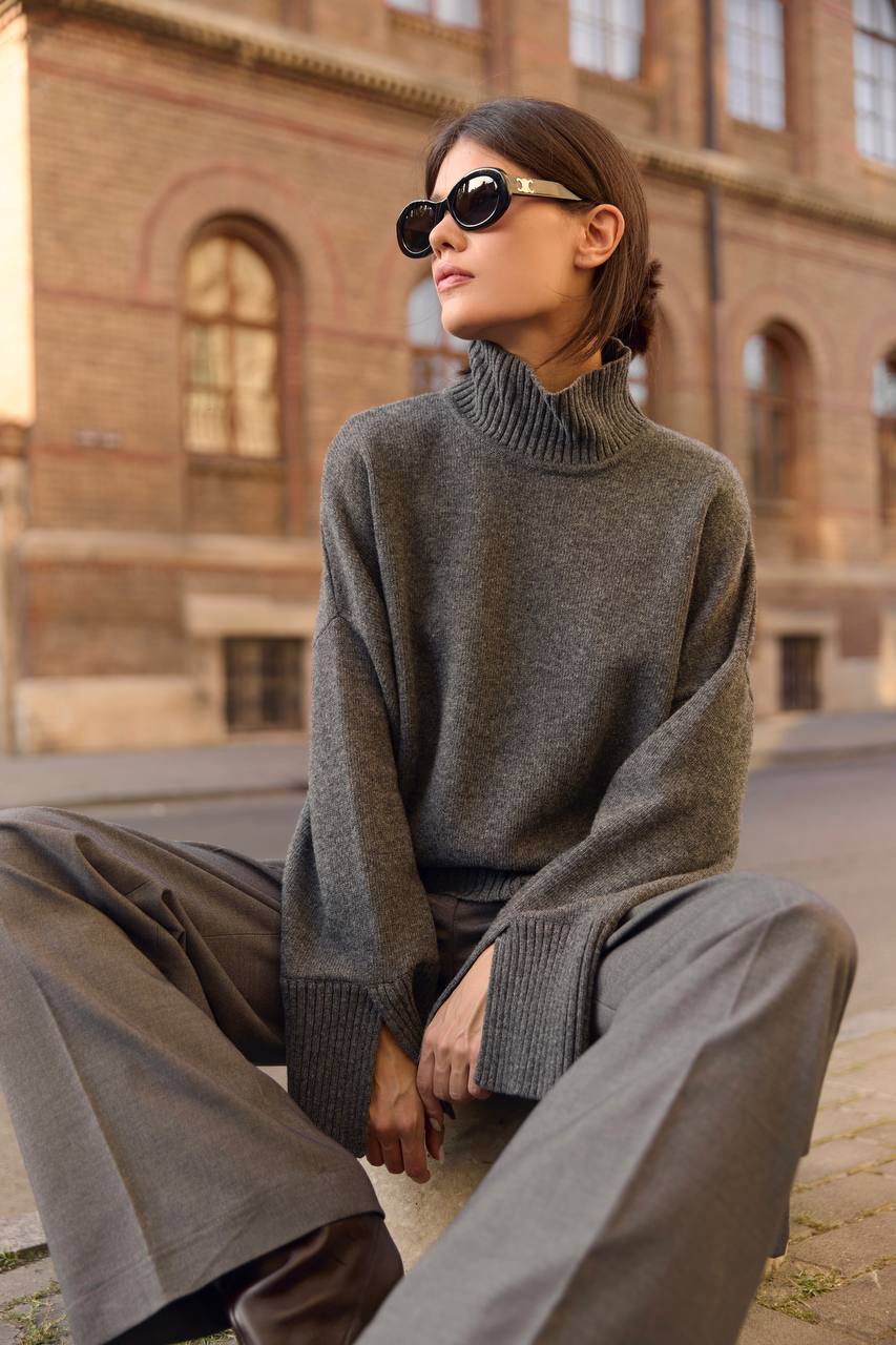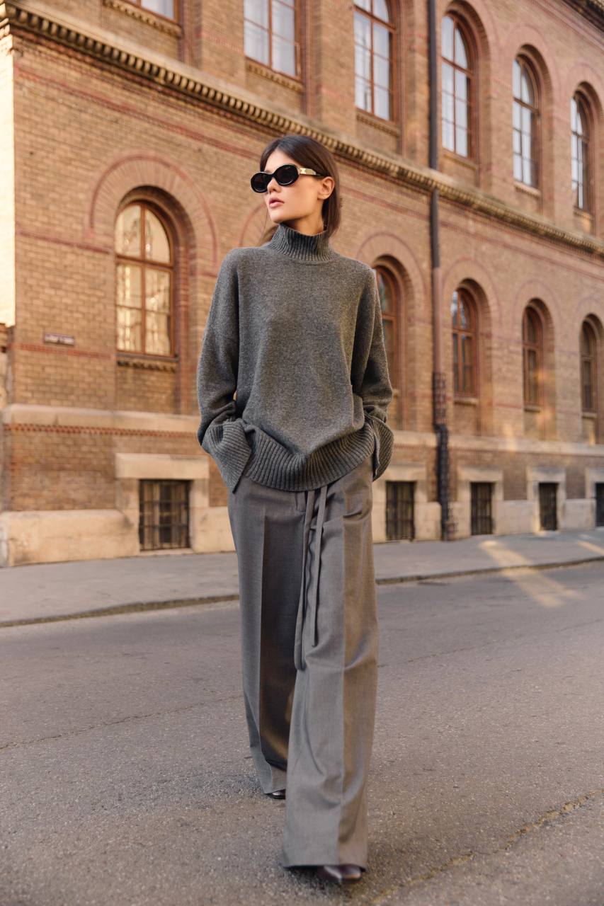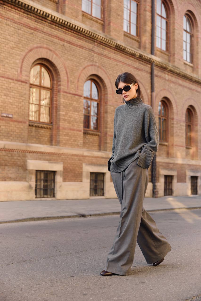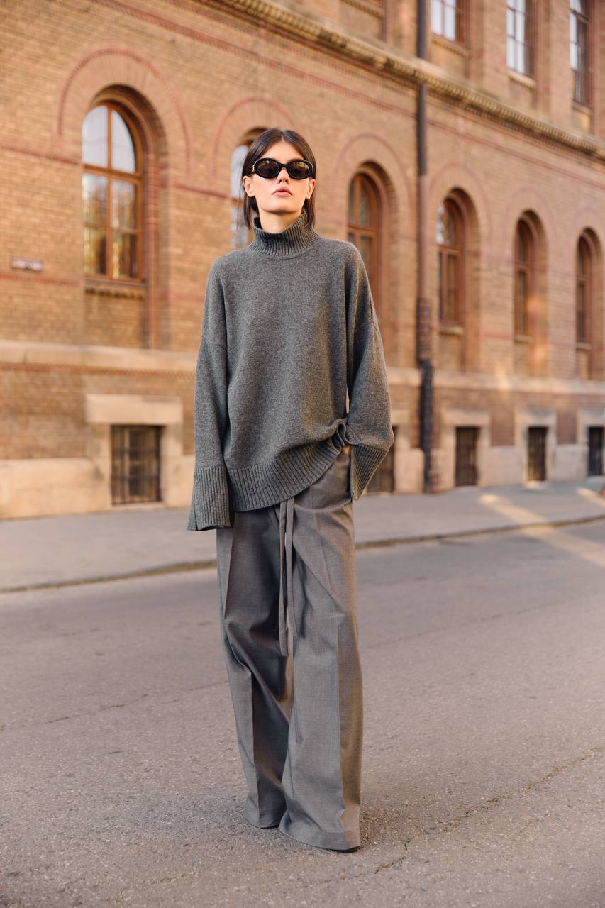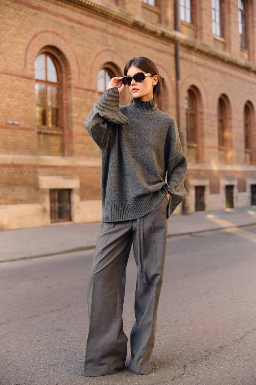 Сувора геометрія та впевненість у кожній лінії. Щільна вовна тримає форму, створюючи чіткий силует, який легко адаптується під будь-який дрес-код. У поєднанні з жакетом чи поло з тієї ж тканини брюки формують завершений total-look — стриманий, сучасний і витриманий.