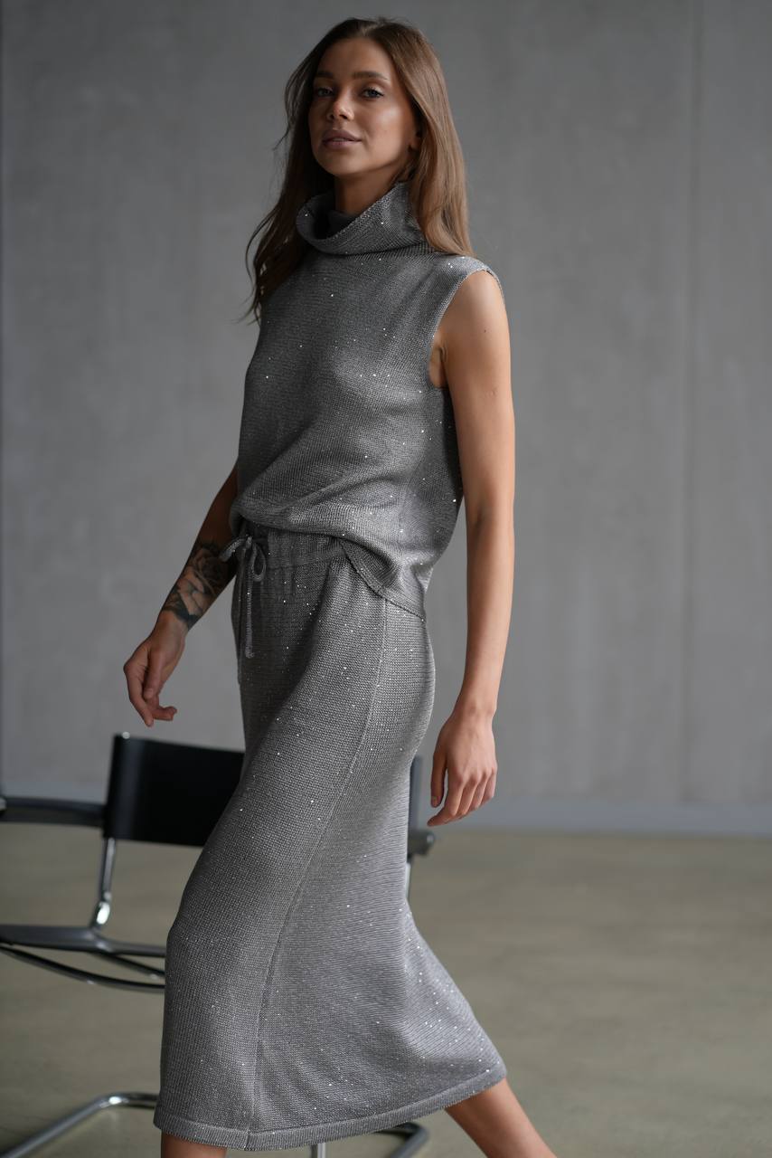 Вʼязаний топ з горловиною у сіро-сріблястій гамі — легкий блиск у кожному русі. Дрібна паєтка створює ефект м’якого мерехтіння, додаючи образу витонченого акценту. Ідеальна база для вечірніх і денних стилізацій з елементом світла.
