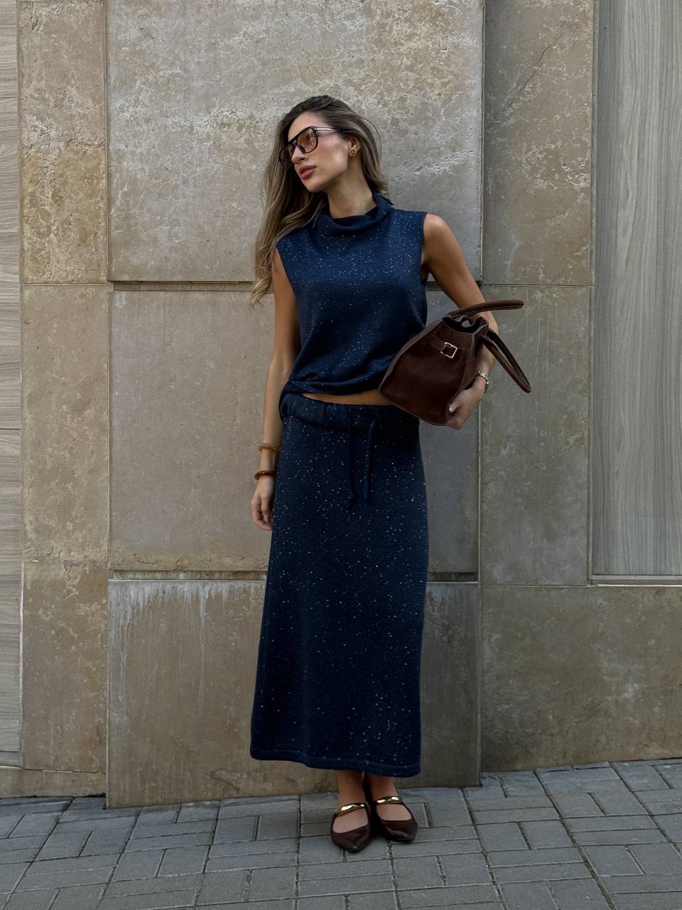 Ця спідниця створена для тих, хто цінує елегантність у кожному русі. Вона поєднує комфорт трикотажу з делікатним сяйвом дрібних паєток, які ненав’язливо ловлять світло й додають образу глибини. Силует міді витягує фігуру та підкреслює жіночність, а насичений синій колір виглядає благородно й сучасно.