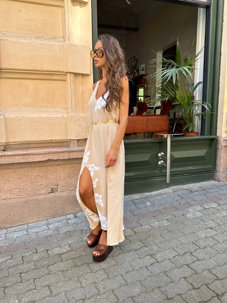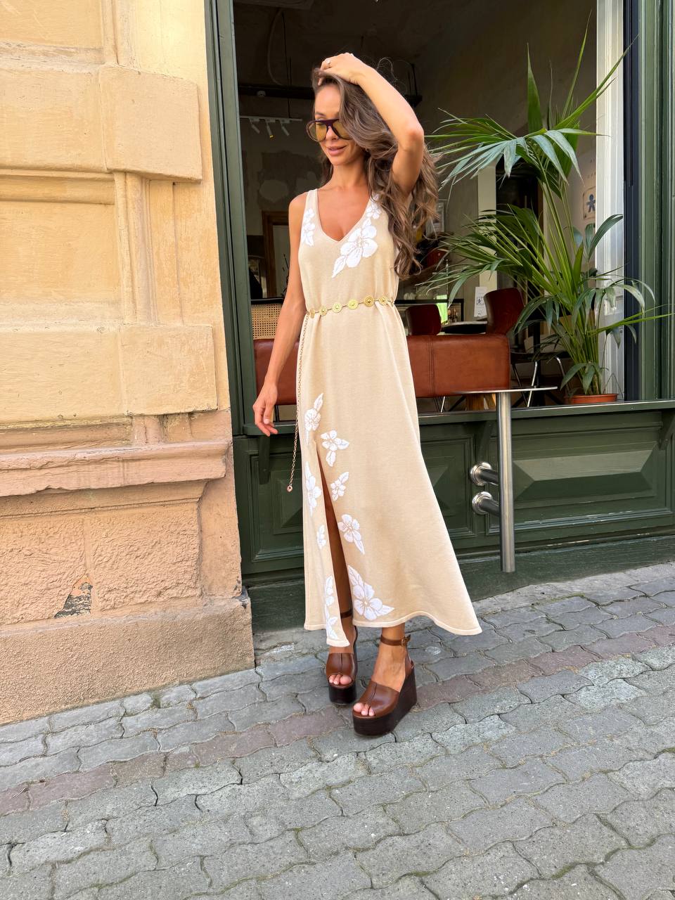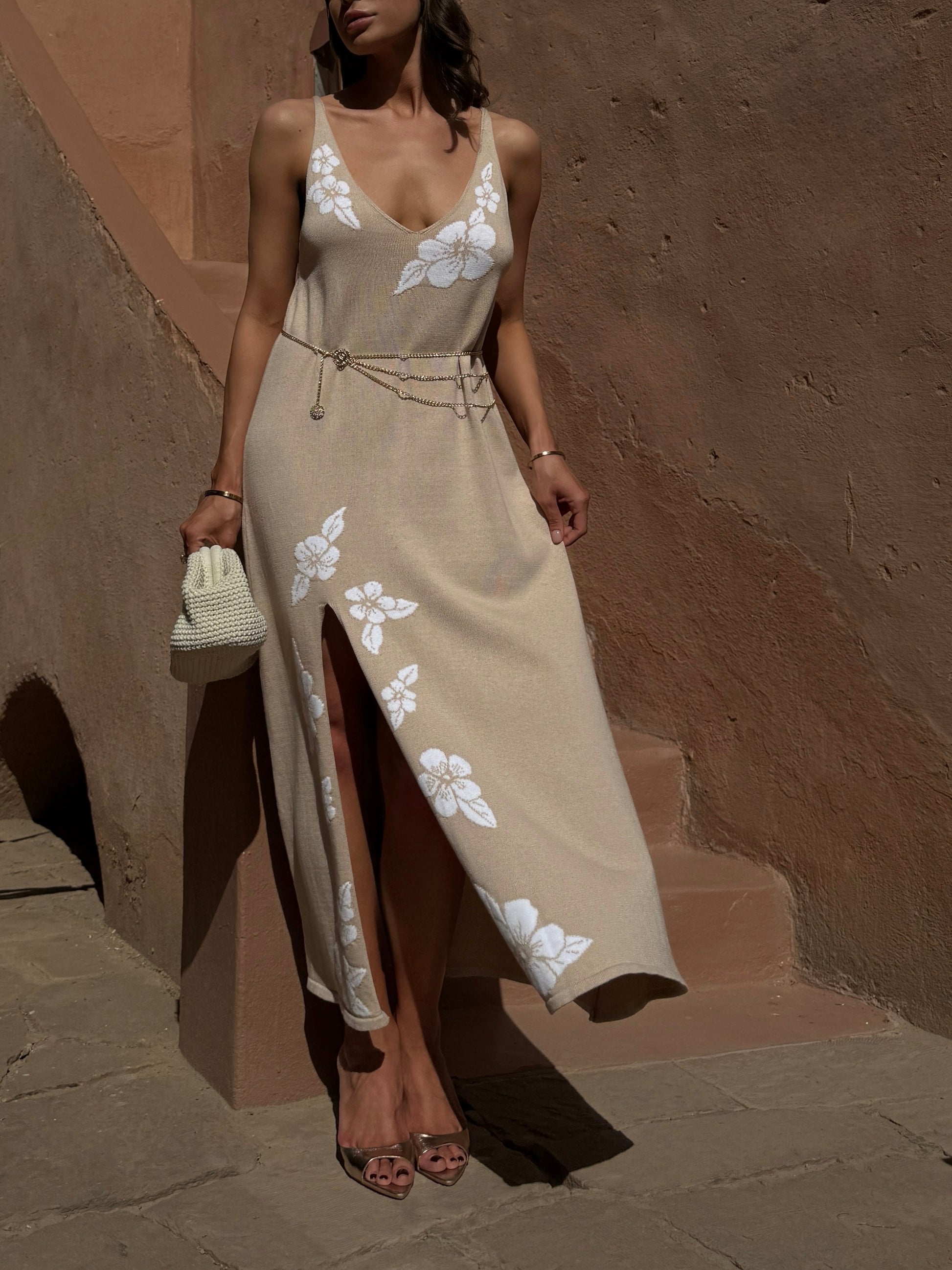 Сукня вʼязана з бавовни з обʼємними квітами, бежевий