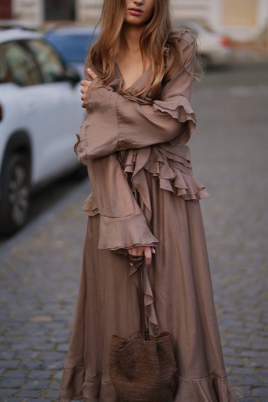 Сукня з шифону з довгим рукавом, карамельна