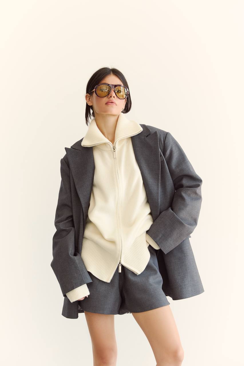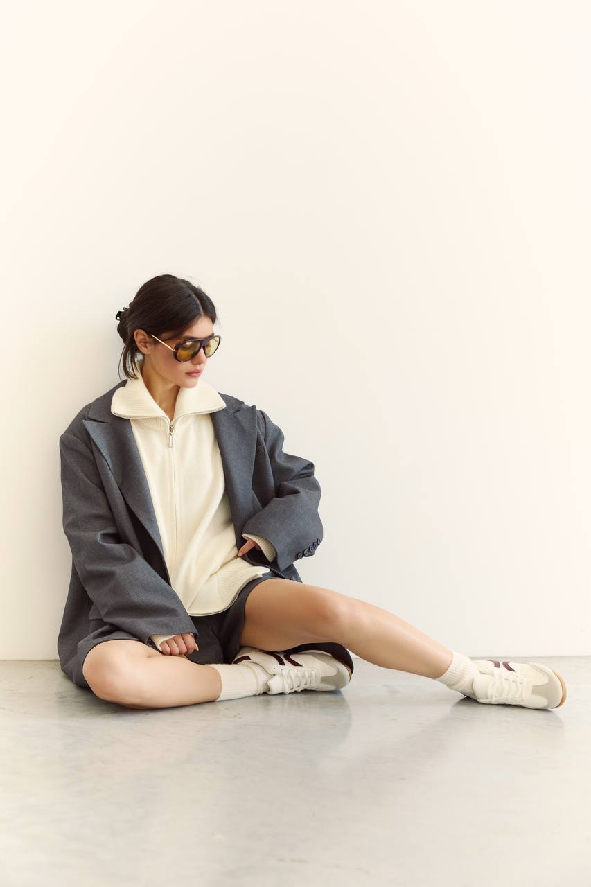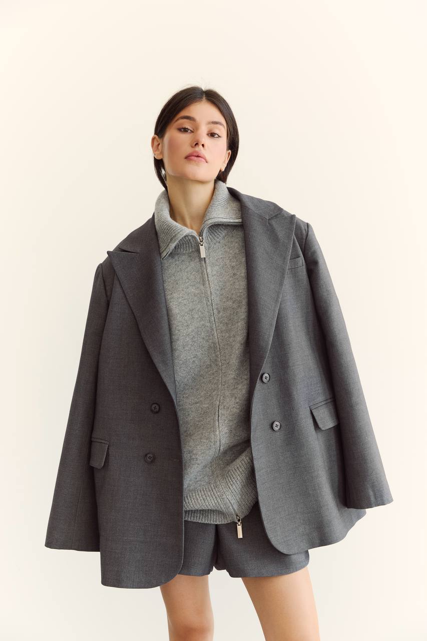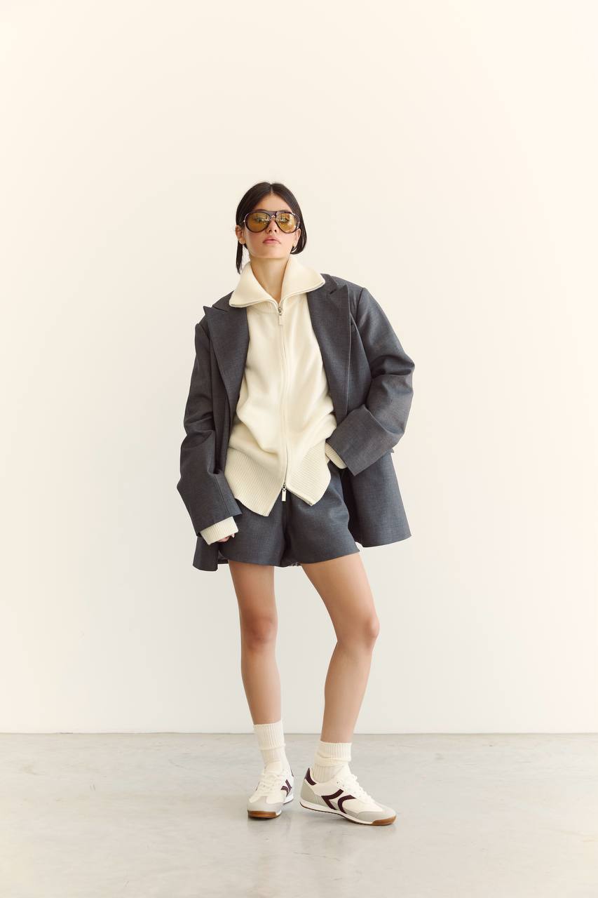 Сірий відтінок у тонкій фактурі — шорти, що поєднують мінімалізм та комфорт. Чудово гармонують із жакетом із вовни, створюючи цілісний, стримано-елегантний образ.