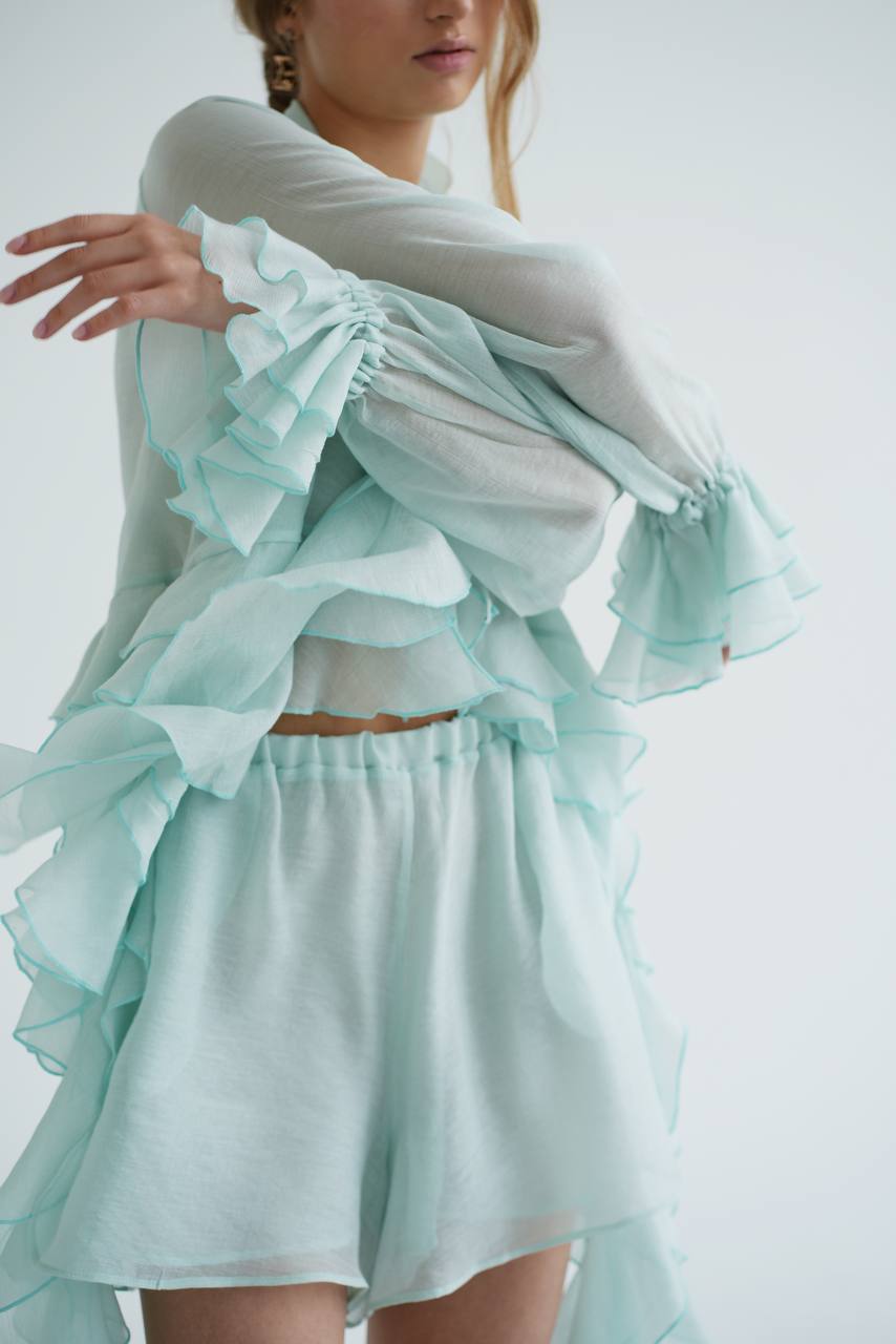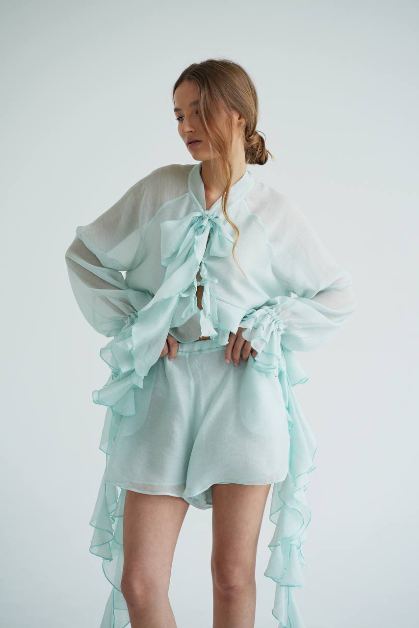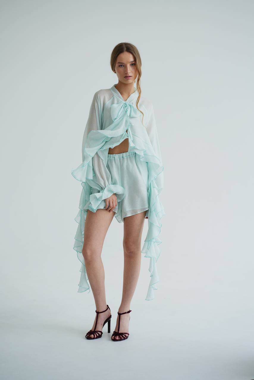Легкі шорти з шифону — втілення витонченості та ніжності. Повітряна тканина м’яко огортає силует, створюючи відчуття легкості та свободи. Ідеально поєднуються з нашою блузою, утворюючи елегантний, ефірний комплект для стильних весняних та літніх образів.