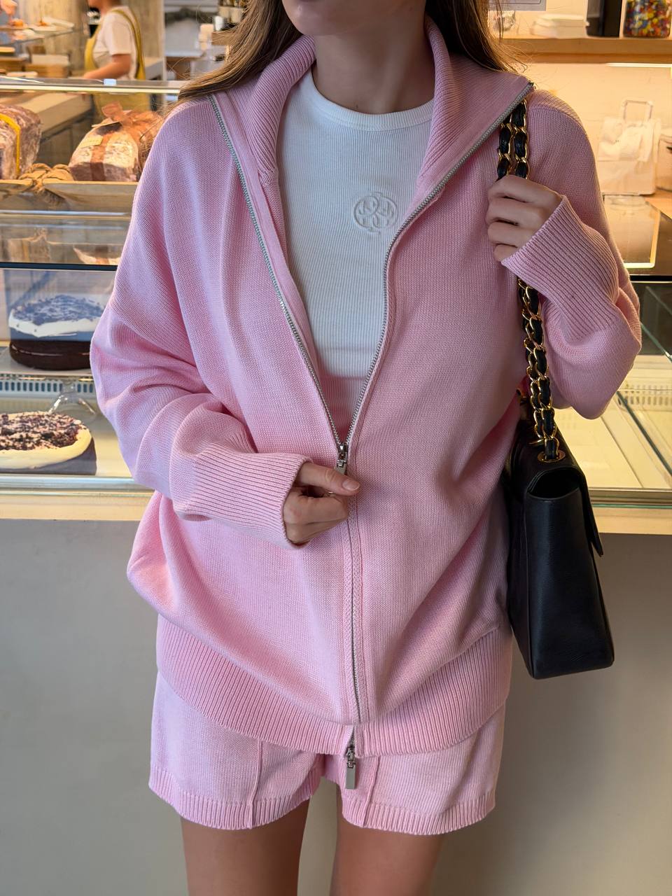 М’який трикотажний комплект у ніжному рожевому відтінку, який поєднує комфорт і стиль у кожній деталі. Кардиган на блискавці з вільною посадкою створює відчуття затишку, а шорти ідеально доповнюють образ, роблячи його легким і сучасним.